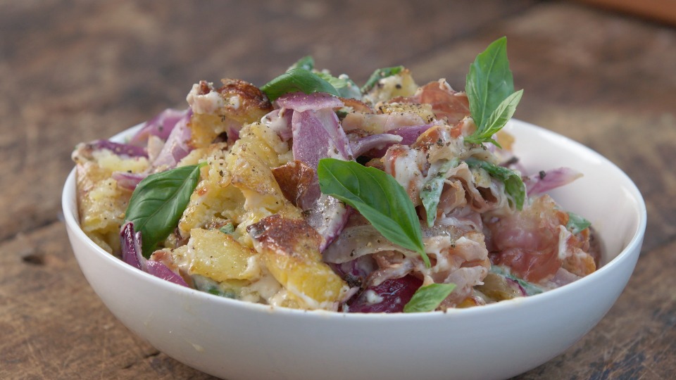 This crispy potato salad takes your usual recipe to the next level, with golden roasted potatoes, sweet red onions, and crispy pancetta, all brought together by a creamy basil and aioli dressing. A perfect blend of crunch, richness, and fresh flavours to elevate your next gathering or meal.