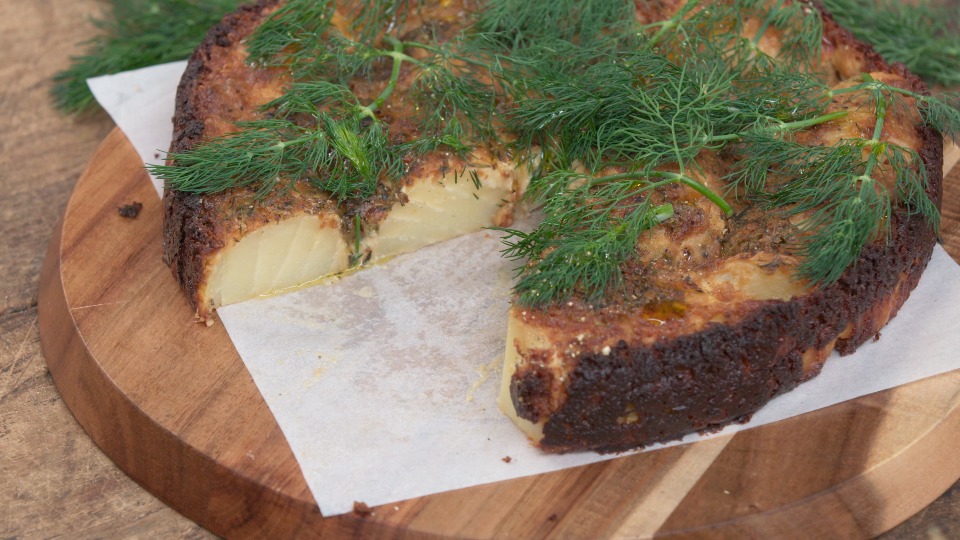 - Lightly grease a 20cm round cake pan or springform tin. Carefully stack the potato slices upright in a circular pattern around the edge of the pan, gradually working inward to fill the centre. Arrange the slices closely together, allowing the natural formation to hold its shape.