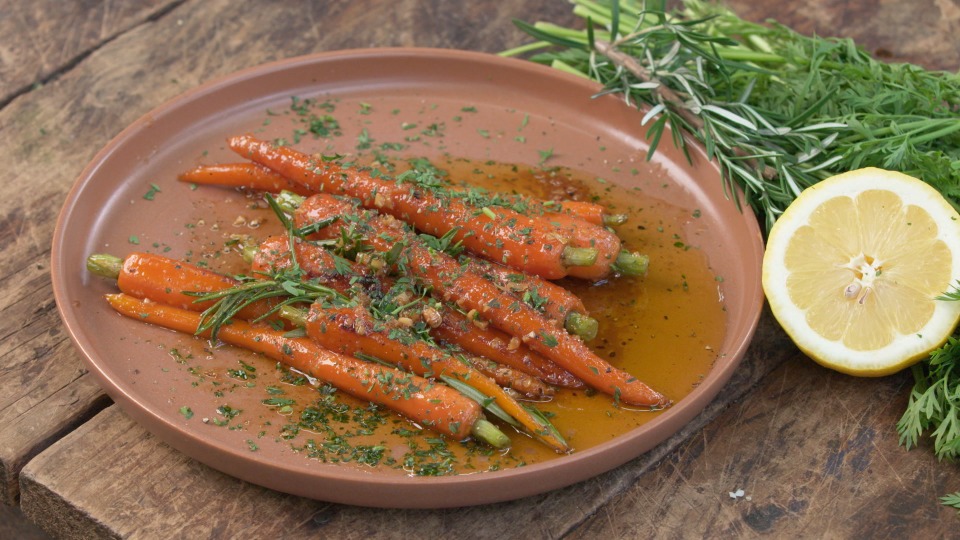 - Remove the lid, increase the heat to medium and add the garlic, butter and rosemary. Baste the carrots in the sauce until well coated, then remove them from the pan and set aside.
