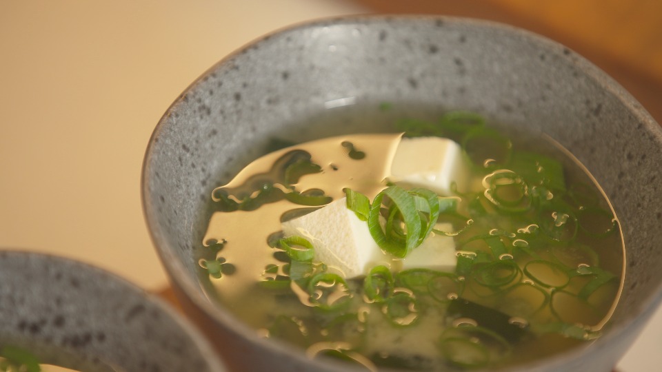 A light, umami-rich Japanese soup made with dashi stock, miso paste, seaweed, tofu, and spring onions.
