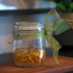 - Peel the ginger and slice it finely to a thickness of approximately one millimetre. This may be achieved with a sharp knife or a mandoline slicer. Transfer the sliced ginger to the prepared jar.